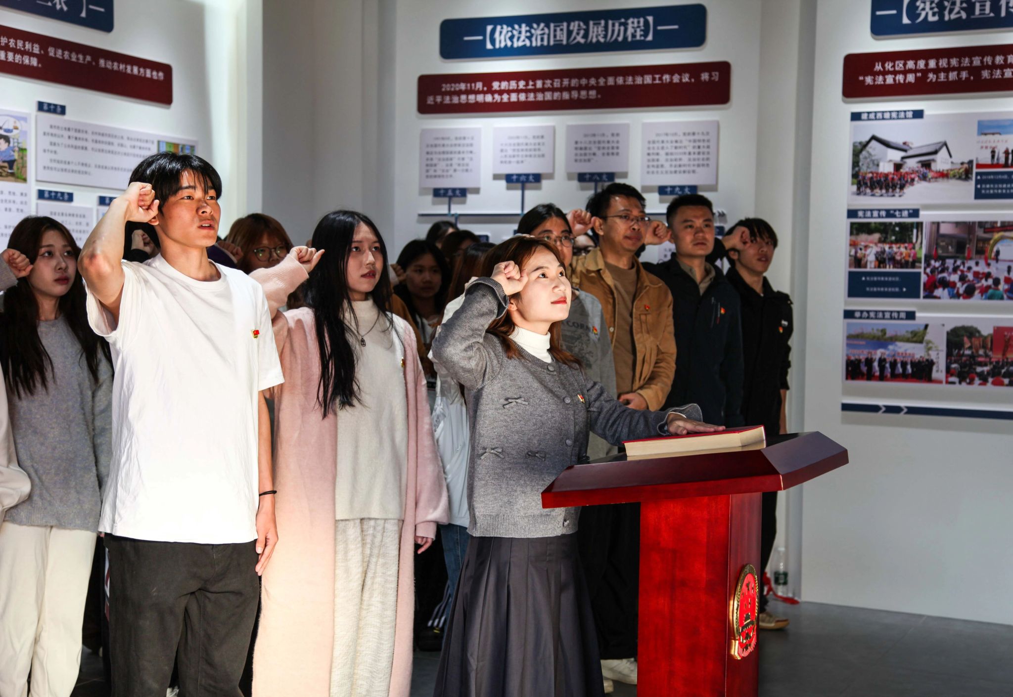 在讲解员的引领下,同学们步入宪法宣誓区,在庄严肃穆的国旗下,全体师生队列整齐,面对着宪法宣誓墙,由陈娜书记担任领誓人,师生们齐声诵读誓言,誓言在展厅中回响,映照出艺创师生对宪法的坚定信念和庄重承诺。
