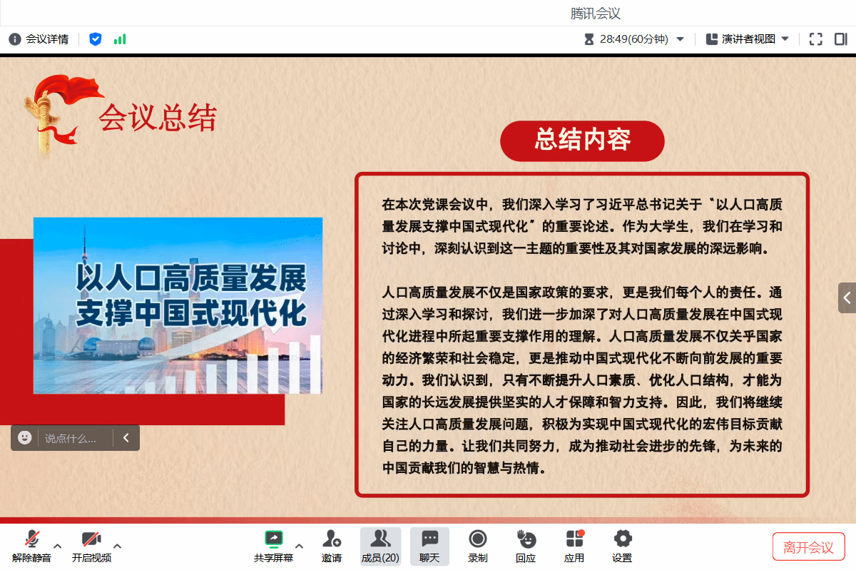 为了加深同志们对“走人口高质量之路,助力中国式现代化”这一主题的理解,感受在新时代背景下,高质量充分就业所带来的具大意义,罗燕青同志组织党内组员观看了中央电视台新闻联播的相关专题报道。