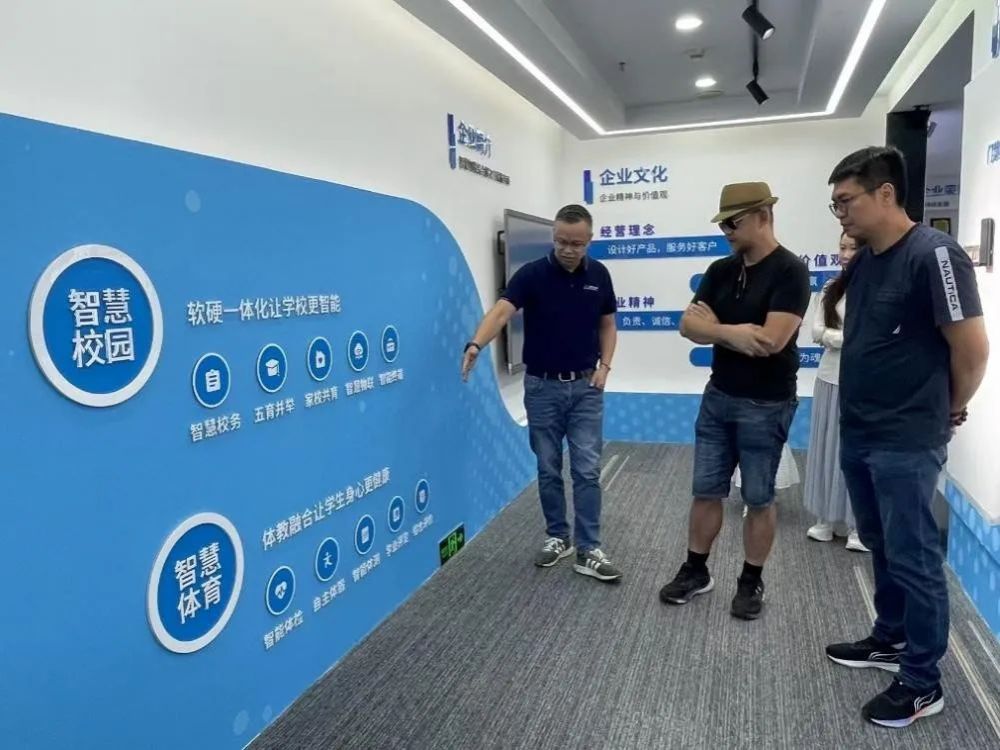 德材教育董事长陈宇明、总经理肖云热情欢迎冯原主任一行的到来,详细介绍了公司的发展历程、经营模式和创新举措,陪同参观了公司的办公场所、科技展厅和文化墙。