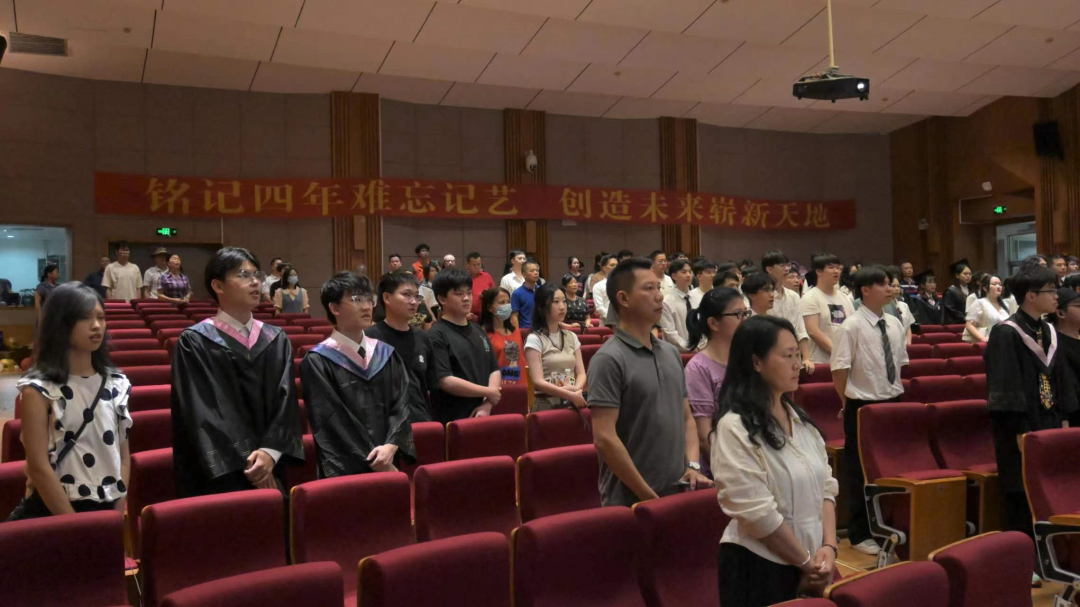 毕业典礼开始,国歌响起,全体师生起立,庄严唱响国歌。
