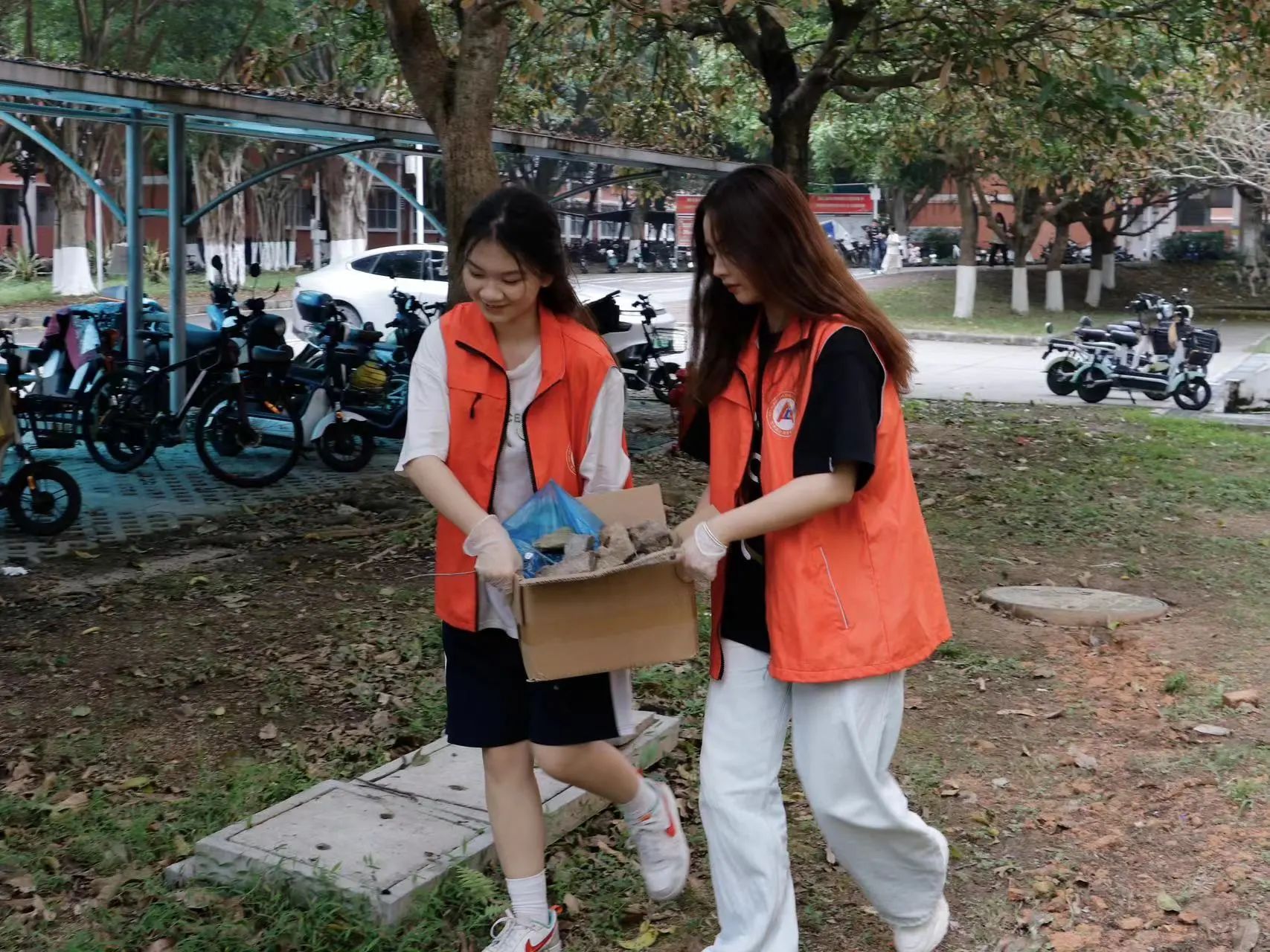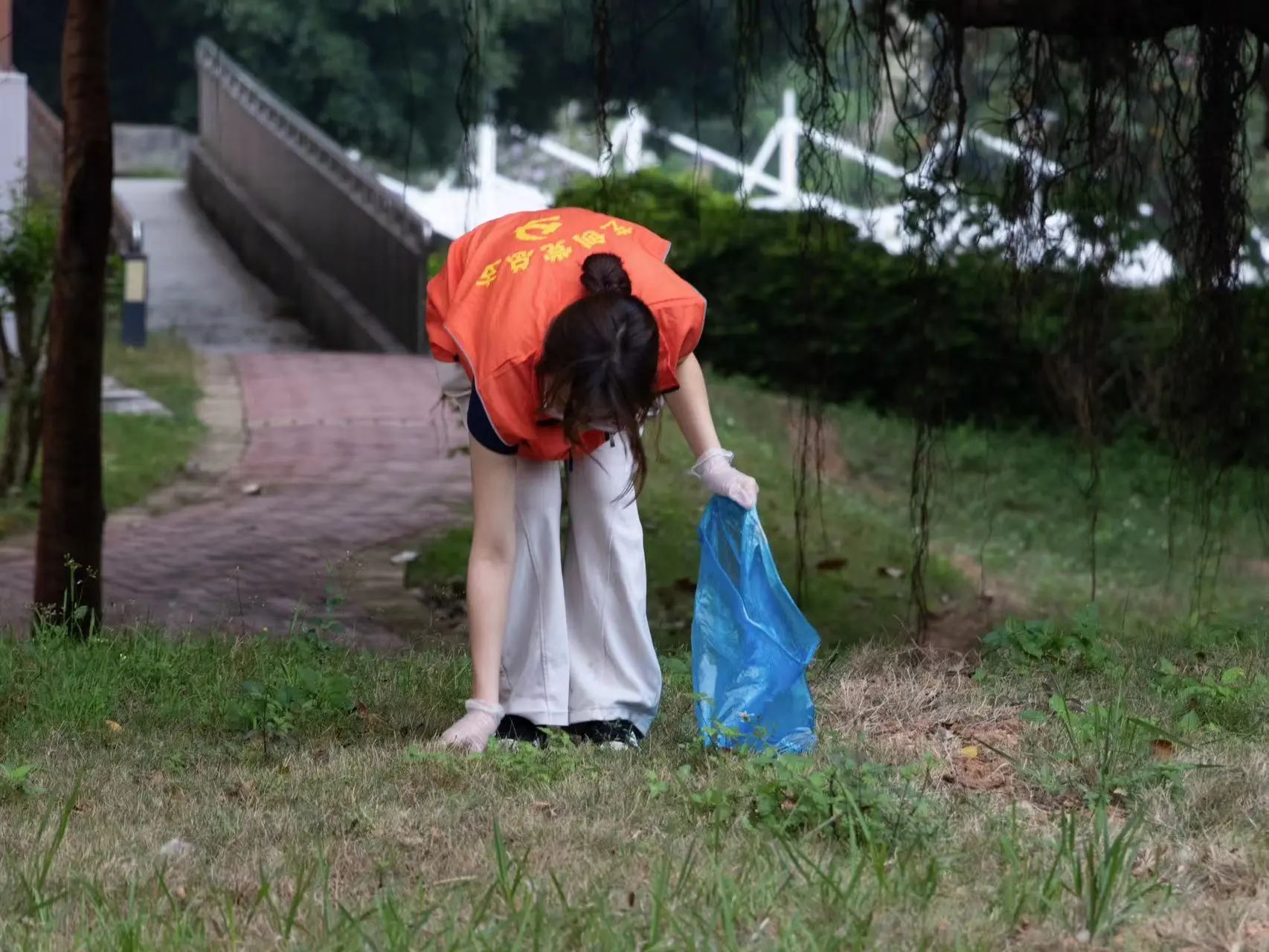 活动当天,志愿者们早早地来到了四号教学楼门口,手持清扫工具,精神饱满地投入到工作中。她们分工合作,有的负责清扫草地上的垃圾,有的负责捡走草地里的大块石头,还有的负责扶起乱停乱放的单车。尽管天气有些炎热,但志愿者们却丝毫不受影响,她们以饱满的热情和细致的态度,将四号教学楼门口打扫得焕然一新。