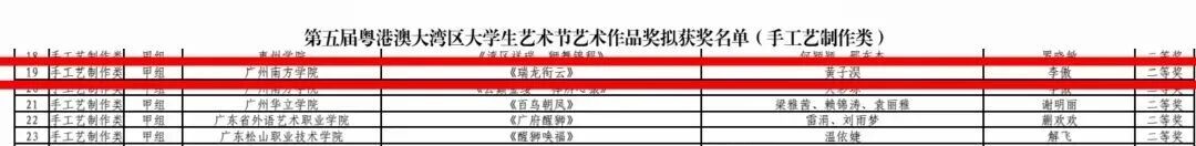 由李傲担任指导教师,黄子淏创作的作品《瑞龙衔云》获艺术作品奖(手工艺制作类)二等奖。