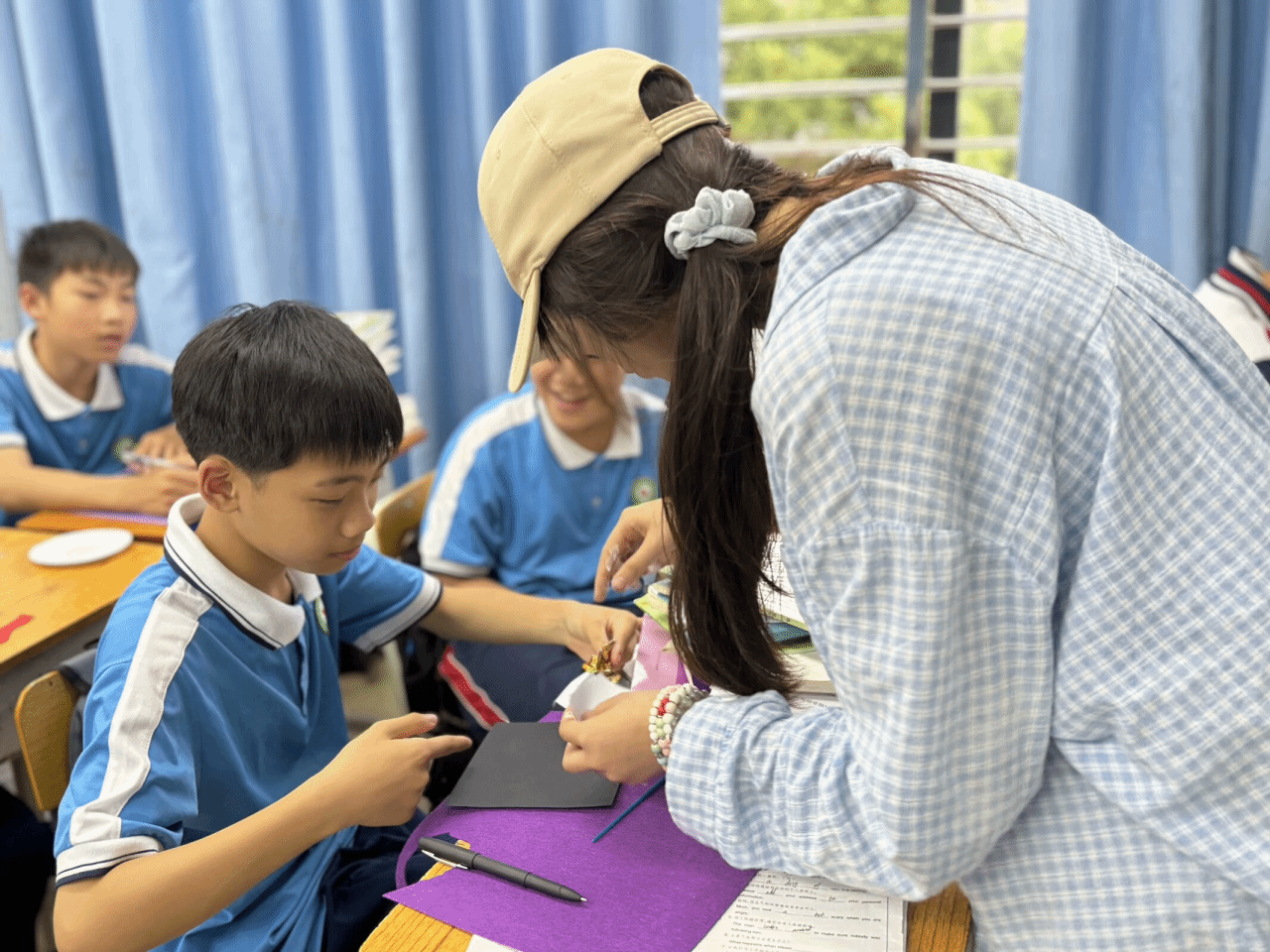 “匠心志愿队”分工明确、配合默契:小老师负责讲解技巧,场控人员穿梭课桌间教授技巧,摄影师用镜头定格员工们认真的模样。全体成员默契配合,为童心与非遗文化架起一座璀璨桥梁,让传统技艺在稚嫩掌心中重生,让文化自信于精雕细琢间萌芽“