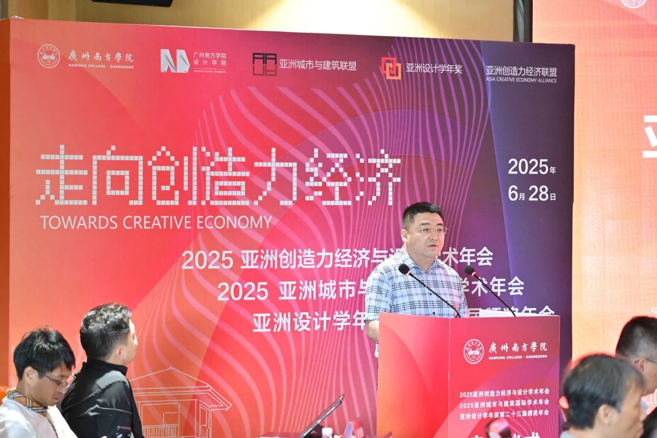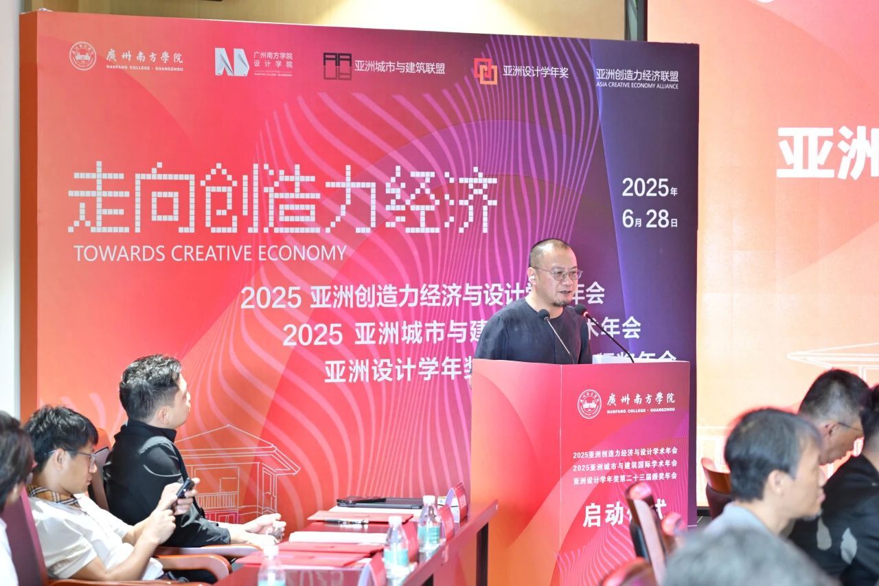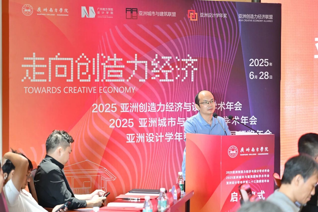 华南理工大学环境设计系主任谢冠一教授发言指出,当前社会和产业面临巨大变革与挑战,设计行业亦不例外。谢教授表示,面对复杂多变的社会环境,设计思维的转型至关重要,并期待通过此类聚会激发更多关于设计教育及产业改革的深入讨论,共同探索未来发展的新路径。